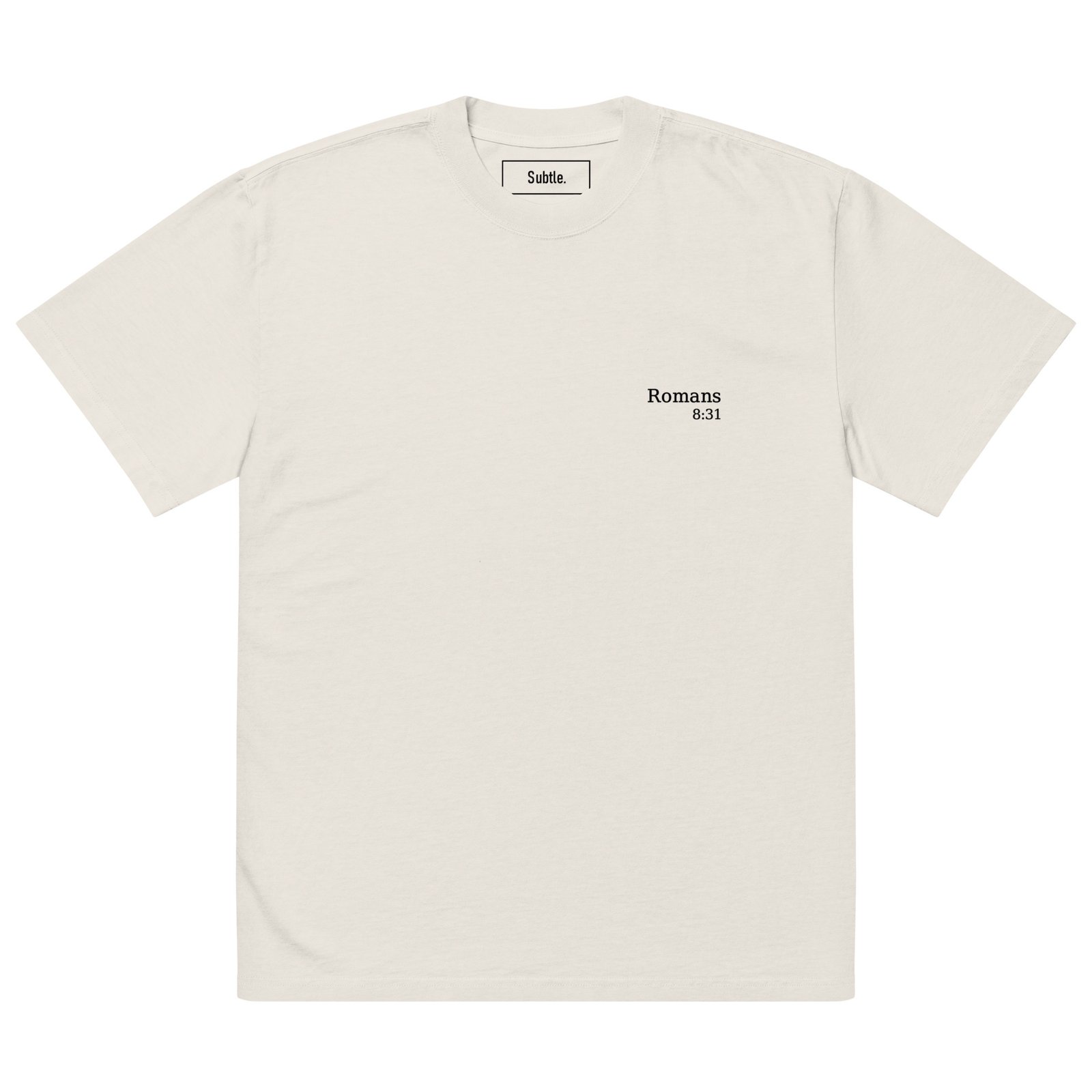 A subtle statement of faith and strength. This oversized faded tee features a minimalist “Romans 8:31” detail — “If God is for us, who can be against us?” Perfect for everyday wear with quiet confidence.