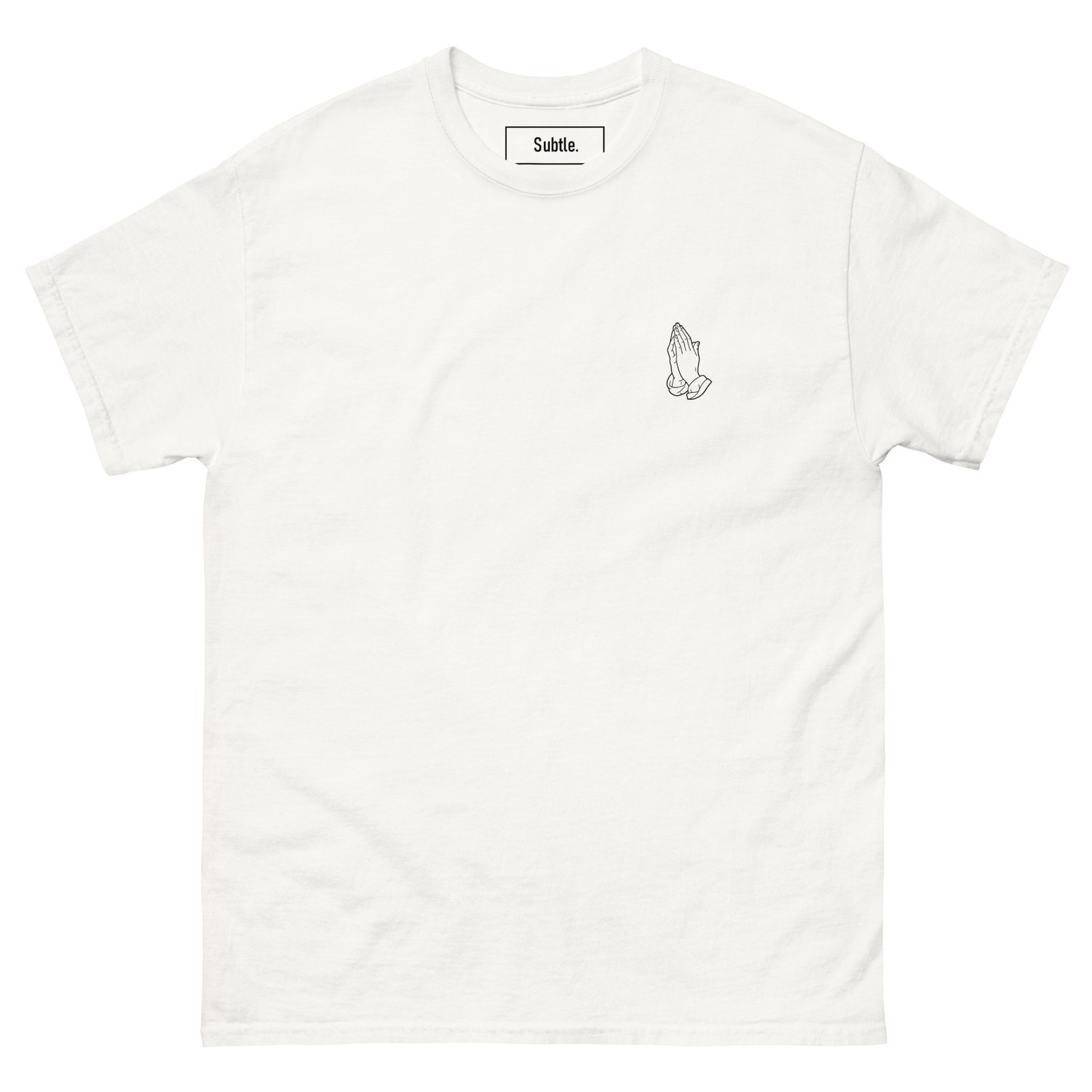 A simple reminder to pause and reflect. This classic unisex tee features a small, subtle symbol of two hands in prayer on the chest. Made from soft, breathable cotton for a comfortable, timeless fit, perfect for everyday wear with a quiet, meaningful touch.